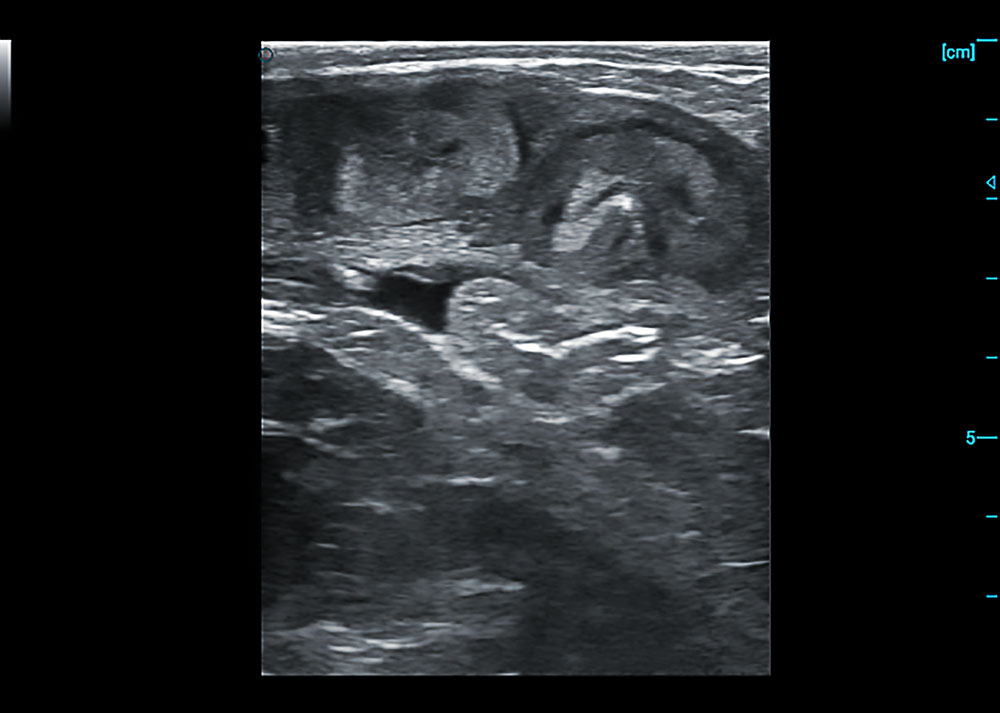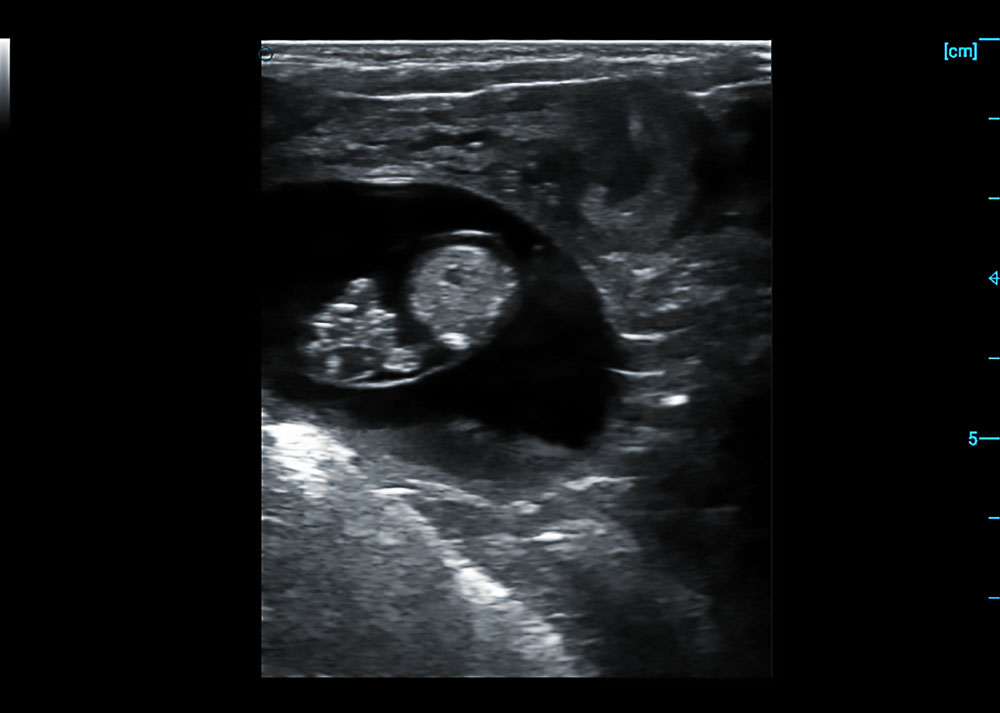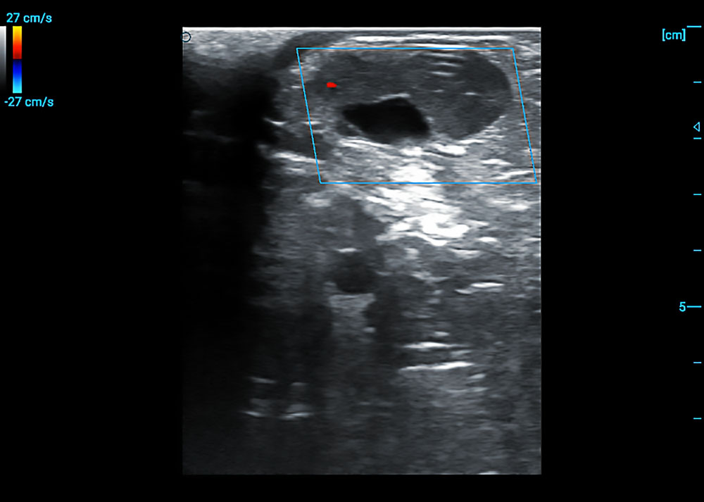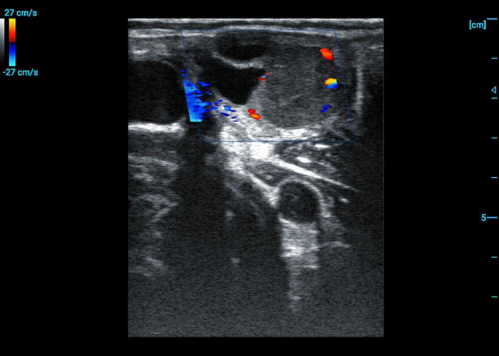 • Distinct vascularization pattern detected via color Doppler assessment.