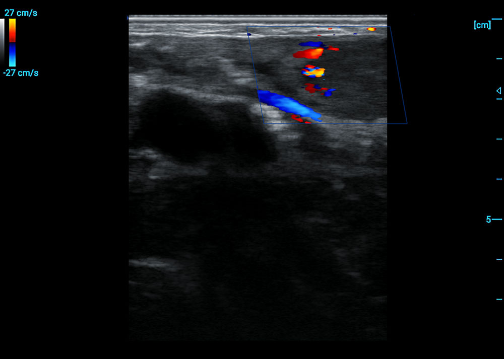 • Active vascularization demonstrated by color Doppler with 27cm/s peak systolic flow.